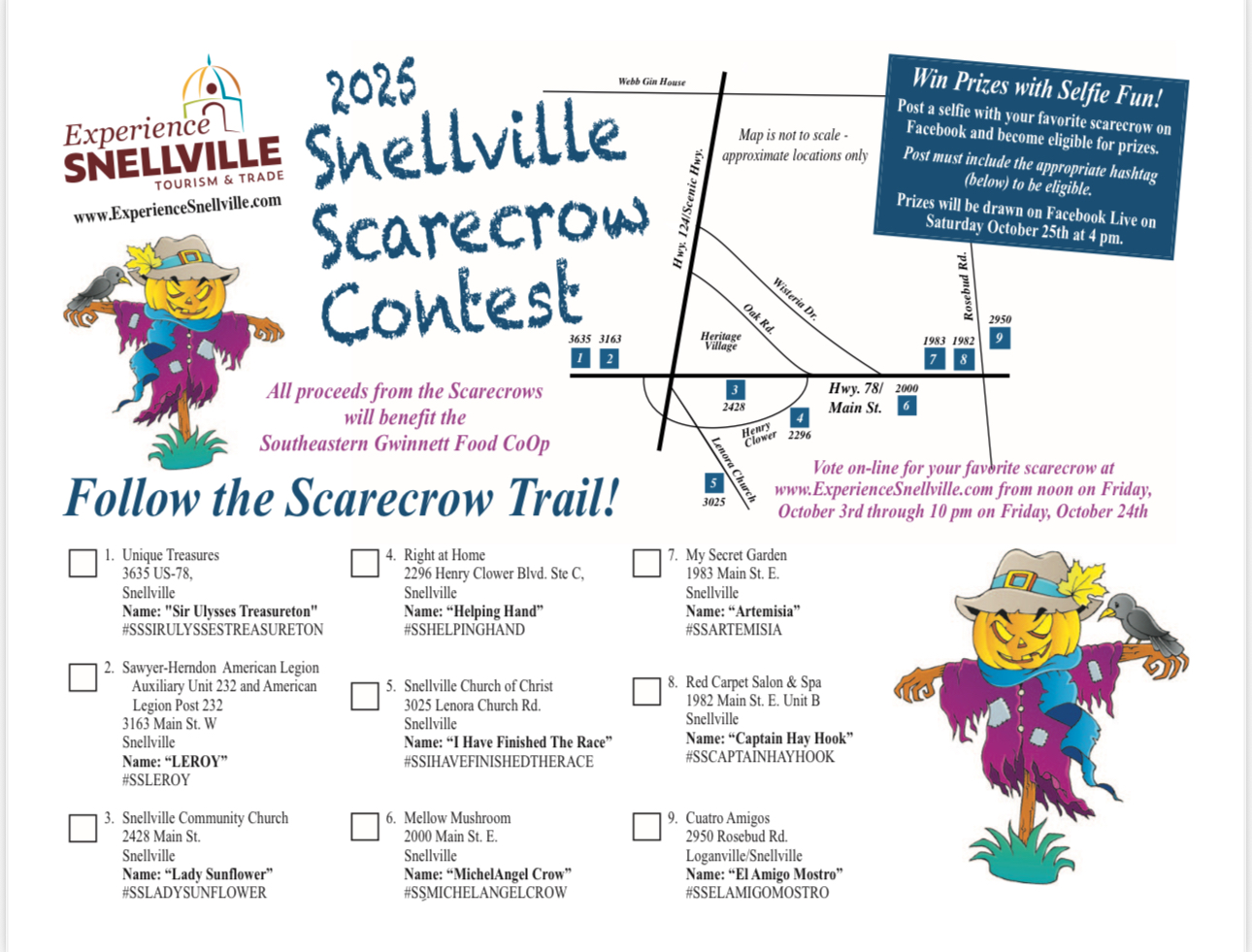 Post a selfie with your favorite scarecrow on Facebook and become eligible for prizes. Post must include the appropriate hashtag (below) to be eligible. Prizes will be drawn on Facebook Live on Saturday, October 25th at 4 pm. All proceeds from the Scarecrows will benefit the Southeastern Gwinnett Food CoOp